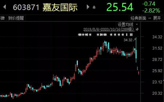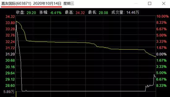 横盘一个月后,10月14日开盘,嘉友国际拉升8个多点至历史最高价34.32元/股,随即快速跳水跌停,最终收跌6.41%,单日成交额创历史新高至4.47亿元。这让一众投资者傻眼。