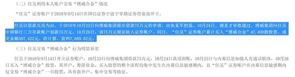 任吴以借款买房为由,于2018年10月23日向博威集团提出借款75万元的申请,由张某军担保。10月24日,谢某才审批通过,博威集团向任吴账户划款75万元。10月26日,该75万元银证转入证券账户。同日,“任吴”证券账户累计买入“博威合金”47400股股票,成交金额307422元,经计算,获利7689.62元。