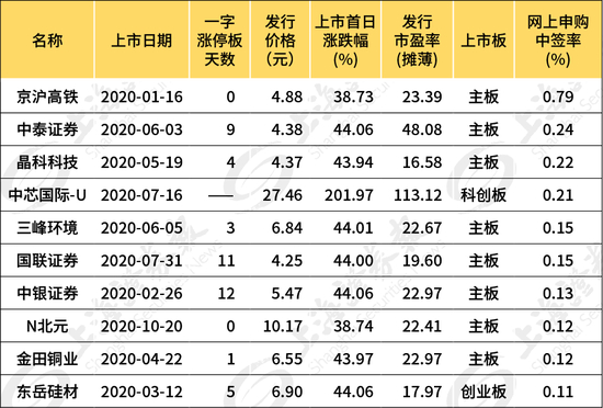 2020年以来网上申购中签率最高的新股TOP10 来源:Wind