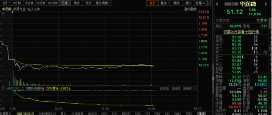 今日华润微早盘低开后便快速下挫,一度大跌超12%,截至发稿,仍跌11.83%,股价报51.12元/股,位列两市跌幅榜首位。