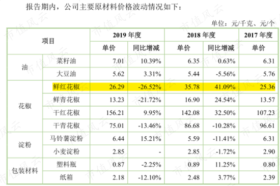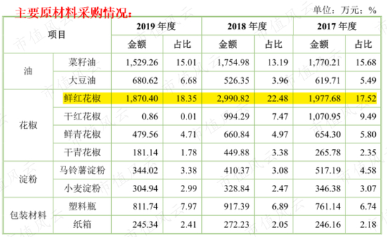至于2019年鲜红花椒采购量明显下滑的原因,公司则表示是“结合库存情况和原材料市场供应情况,适当控制了花椒等原材料采购规模”。