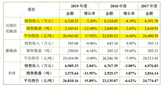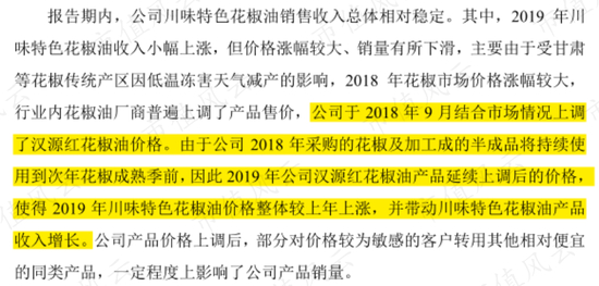 公司解释称,公司在2018年9月已结合当时的市场情况开始调价,并在2019年全年延续该价格,因此汉源红花椒油在2019年的平均售价高于2018年。