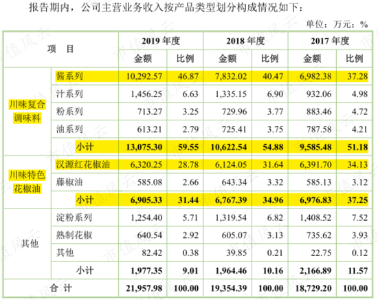 公司的主要产品是川味复合调味料和川味特色花椒油,两者在2019年的收入占比分别为59.6%和31.4%。