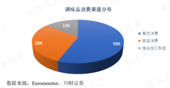 餐饮端是我国调味品行业最大的市场需求,其消费占比在2018年为56%,家庭消费与食品加工分别占30%和14%。