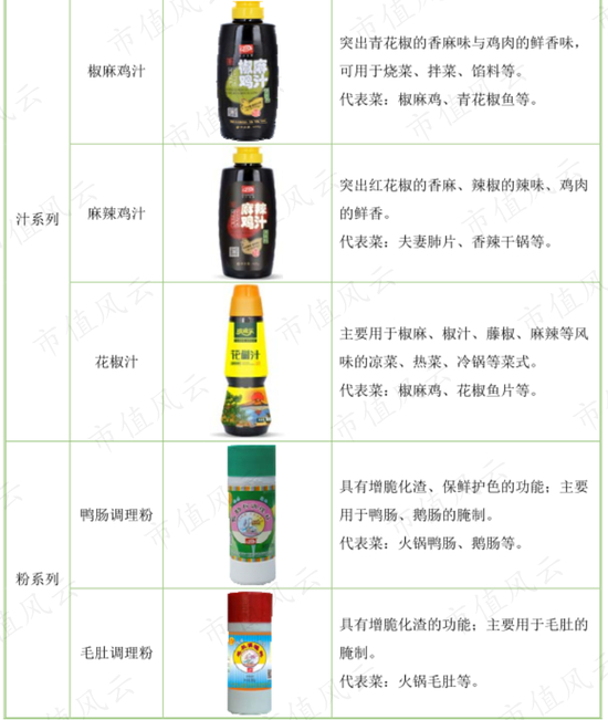 比如,公司的川味复合调味料汁系列产品包括用于制作椒麻鸡的“椒麻鸡汁”、制造夫妻肺片和香辣干锅的“麻辣鸡汁”和制作花椒鱼片的“花椒汁”。
