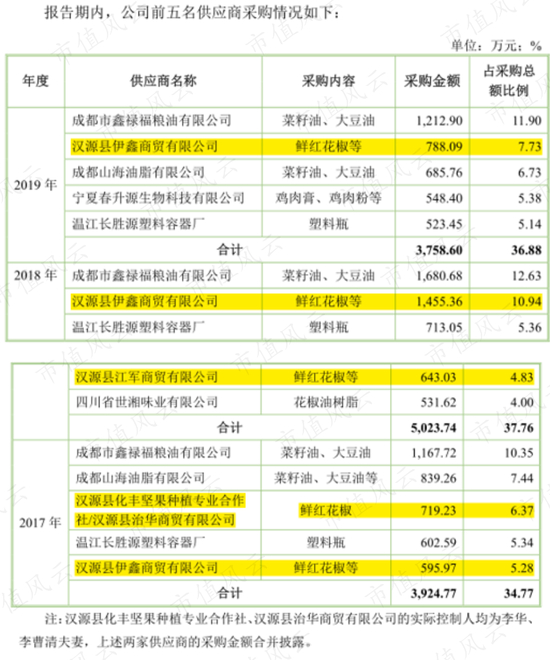 2017-2019年,公司分别向汉源伊鑫采购了596万元、1455万元和788万元鲜红花椒,分别占当年鲜红花椒总采购金额的42%、49%和30%。