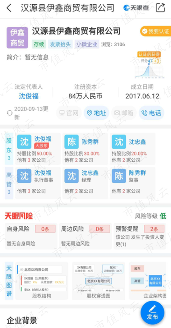 第三方数据显示,汉源伊鑫成立于2017年6月12日,据披露为公司的非关联方。