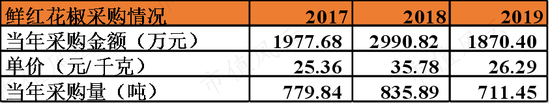另外计算得出,公司在2018年鲜红花椒的采购量较去年同期增长了7.1%,在2019年则同比减少14.9%。