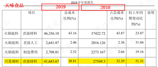 2019年,由于花椒价格的大幅上涨,天味食品川菜调料的直接材料成本占总成本的比重较去年同期上升了6.5个百分点。