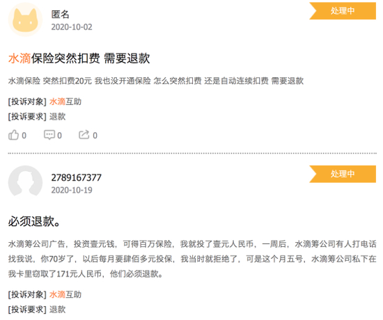 另有用户通过微博表示,水滴保险以1元保费引诱中老年人投保,实际合计一年保费需要扣款一千余元,并通过电话营销,“忠实老客户回馈升级千万保金”,引导老人继续消费。在提出退保要求后,客服人员仅表示可以关掉自动付费,不能退保。