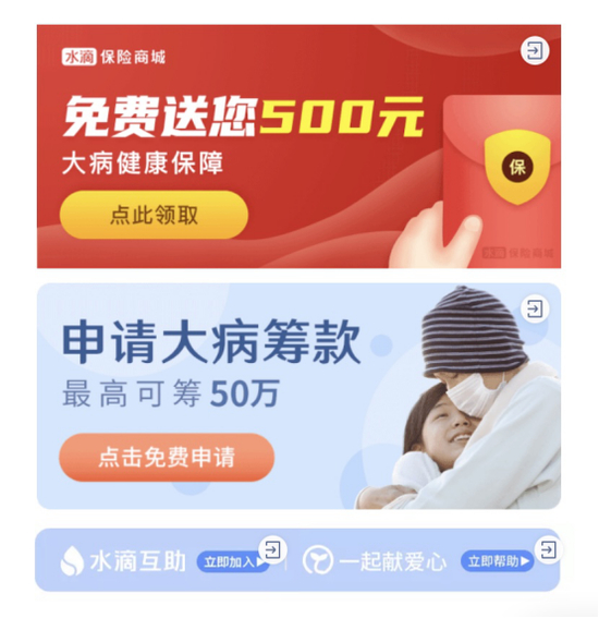 10月20日上午,圆圆君打开水滴筹官方公众号注意到,公众号关于众筹案例的推文结尾处,几乎都设置有醒目的红色贴片广告,“免费送您500元大病健康保障”,提醒用户可以点击领取。