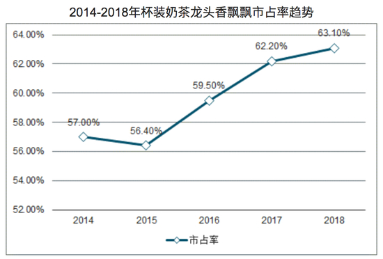 智研咨询数据显示,香飘飘在杯装奶茶的市占率已由2014年的57%上升到了2018年的63.1%。