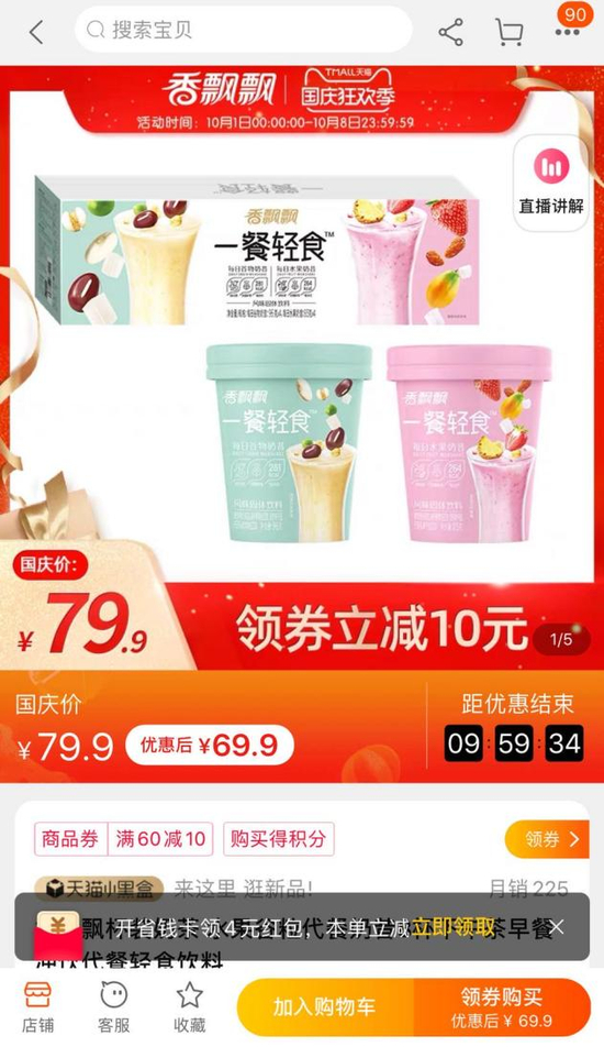 ‘子弹财经’走访北京市多家线下商超,并未发现香飘飘麦片和奶昔产品。在香飘飘天猫旗舰店内,也未搜索到麦片产品。而奶昔产品的销量也并不高,截至10月7日,奶昔产品8杯券后价为69.9元,月销只有225单。