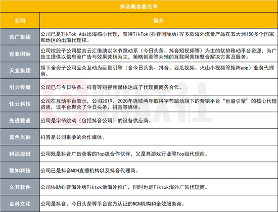 抖音概念有省广集团、宣亚国际和天龙集团等,其他见下图。