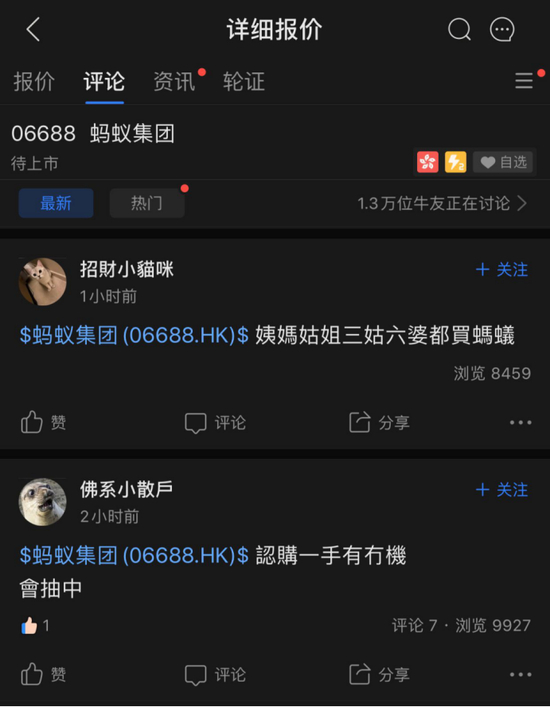 10月27日个人投资者开始打新,当天上午场面火爆,有港股券商交易系统一度出现卡顿。多位富途证券客户在评论区表示,“三姑六婆都买了蚂蚁”、“将人生中第一次打新给了蚂蚁集团!”,且多人晒图已认购完成申购。参与蚂蚁集团打新时,富途页面多次显示“系统繁忙”现象。