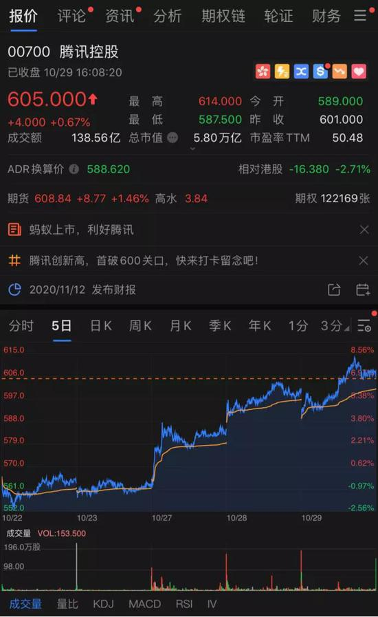 另外一个有意思的现象是,在蚂蚁申购火爆的同时,腾讯近日以来一直大涨,股价首次突破600港元关口,截至10月29日收盘,其总市值为5.80万亿港元。