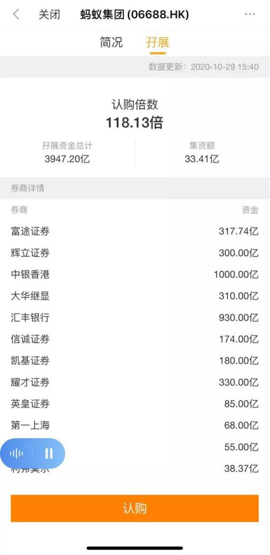 此外,截至10月29日下午15点40分最新数据显示,蚂蚁集团港股孖展已超3900亿港元,超购118.13倍。