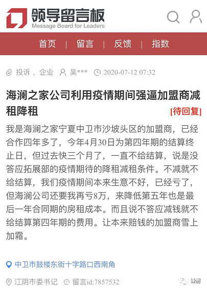 但海澜之家的盈利为正背后,事实上牺牲的是加盟商的利益。长期以来,加盟商们对海澜之家的把销售资金统一划拨管理、门店员工的待遇与管理问题一直多有诟病。如今疫情之下利润空间受到压缩,处于弱势的加盟商不甘受到进一步压榨,有宁夏的加盟商直接向海澜之家起家地的江阴进行了投诉。