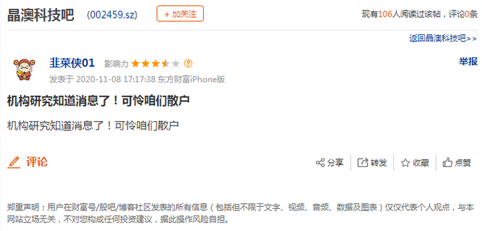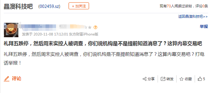 对此,有股吧网友留言称:“礼拜五跌停,然后周末实控人被调查,你们说机构是不是提前知道消息了?这算内幕交易吧”、“机构研究知道消息了!可怜咱们散户”、“机构消息果然先知先觉”;