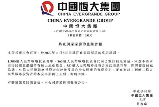 同时,中国恒大(3333.HK)也发布公告称,公司董事会宣布于2020年11月8日决议终止与深深房的重组计划。