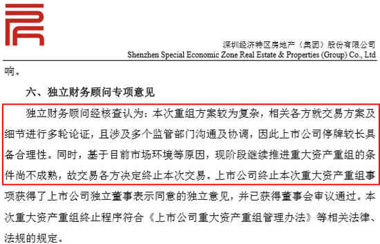11月8日晚间,深深房表示,基于目前市场环境等原因,现阶段继续推进重大资产重组的条件尚不成熟,为切实维护公司及全体股东利益,经公司审慎研究并与交易各方友好协商,决定终止此次交易事项。