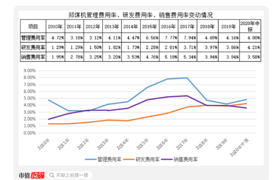 从费用率的角度看,收购汽车零部件资产后,郑煤机的管理费用率、销售费用率出现一定下降,其中,销售费用率有所下降,管理费用率回到4%-5%区间,研发费用了逐年上升。