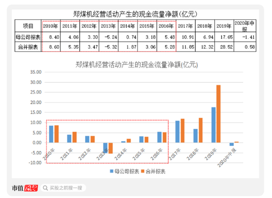 上市公司的煤机业务主要集中在母公司,也就是说,母公司经营活动生产的现金流即为煤机业务经营活动产生的现金流。2010-2016年,郑煤机母公司报表与合并报表的现金流净额相差不大(2014年除外),也可证明确实如此。