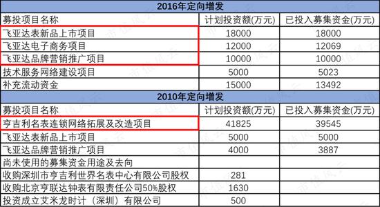 自1994年A股上市以来,飞亚达分别在2010年和2016年做了两次定增,然而最早2010年定增的重点是亨吉利名表连锁业务,2016年定增重点才是飞亚达自有品牌。
