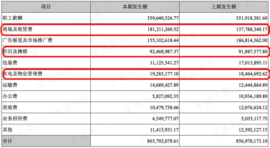 销售费用中,职工薪酬也是最多的,此外还有很多与门面相关的费用,比如商场租赁费、折旧及摊销、水电物业管理费用等。