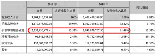 让人惊讶的是,飞亚达占到93.50%的核心业务为手表业务,但收入占比最高的是手表零售服务业务,占营业收入比例为63.52%。
