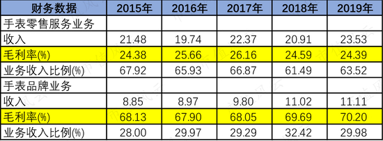 既然手表零售业务是进口代销性质,毛利率自然比手表品牌业务低很多:2019年手表零售业务的毛利率为24.39%,而手表品牌业务的毛利率有70.20%。