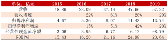 竞争壁垒高,加上名贵药品有提价空间,片仔癀这些年的业绩表现非常不错。2015-2019年,营收从18.86亿元增至57.22亿元,年复合增速达31.98%;归母净利润从4.67亿增至13.74亿,年复合增速达30.97%。ROE近三年保持在20%以上。