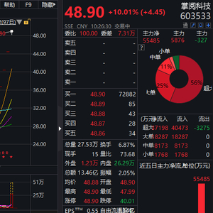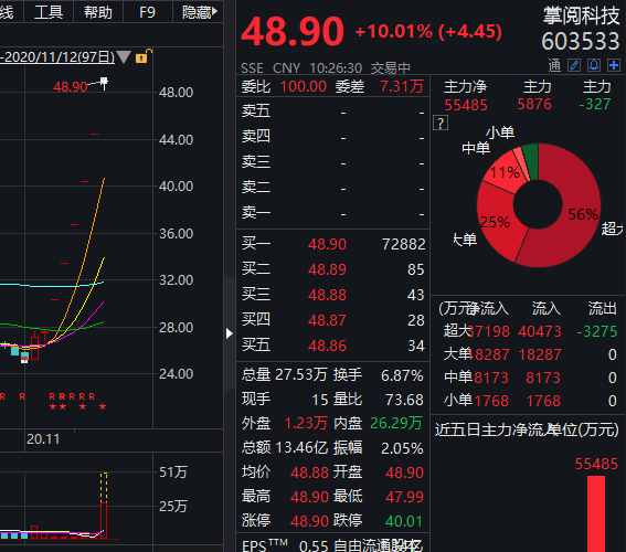 周四早盘,掌阅科技再度一字涨停,截至发稿,报48.9元,该股连续第6日涨停,截至今日累计涨77.71%。