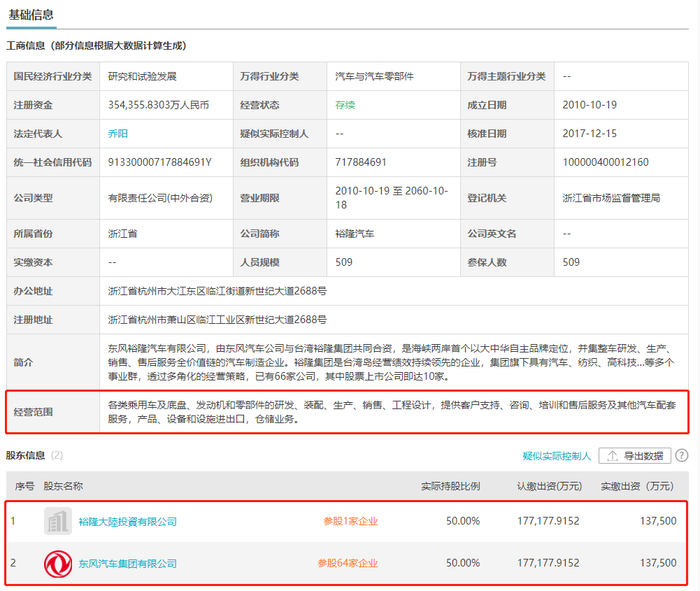 网站显示,东风裕隆汽车销售有限公司成立于2013年3月,注册资金5千万元。裕隆(中国)汽车投资有限公司和东风汽车集团有限公司分别持股50%,而裕隆(中国)汽车投资有限公司则由裕隆汽車投資有限公司100%持股。