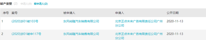 破产传言的出处,来自于一条东风裕隆汽车销售有限公司的破产申请信息。经Wind查询显示,11月13日,东风裕隆汽车销售有限公司新增破产信息,申请人为北京正点未来广告有限责任公司广州分公司。