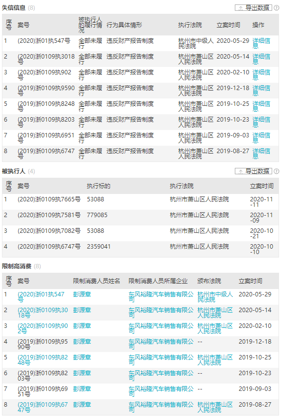 另外,东风裕隆汽车销售有限公司还存在多条失信信息和被执行信息,公司法人代表彭源章也被限制高消费。