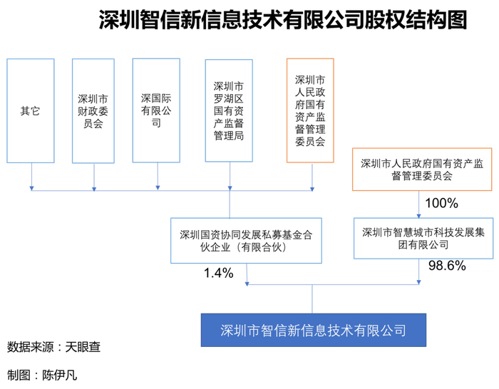 综合目前的收购方案及天眼查显示的股权结构,荣耀的收购方深圳智信新的两大股东分别是深圳市智慧城市科技发展集团有限公司(占股98.4%)和深圳国资协同发展私募基金合伙企业(占股1.4%),其中深圳市智慧城市科技发展集团有限公司由深圳市国资委全资持有(参见下图)。