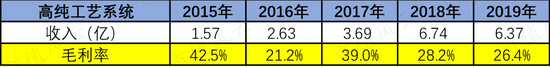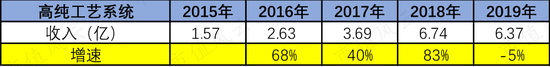 从整体高纯工艺系统来看(包括半导体、LED、光伏、医药等),至纯科技2016年-2018年之间高纯工艺系统收入同比增长68%、40%、83%。不过2019年高纯工艺系统收入仅6.37亿,同比略微下滑。
