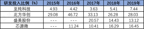 至纯科技一直以来的研发投入/营业收入并不高,基本都在5.5%以上,2019年有所提高到7.44%,不过资本化率也同步提高了。