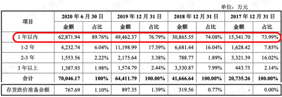 具体从存货库龄情况来看,2017年-2019年底1年以内的存货占到四分之三,2020年中一年以内的存货高达89.76%,说明以往的订单已陆续交付。