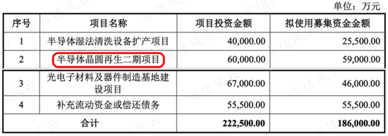 这次定增除补充流动资金或偿还债务之外,拟投资的项目为:半导体湿法清洗设备和光电子材料都是原有项目产能扩张,而半导体晶圆再生则属于新业务。