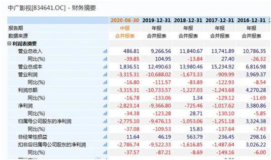 2015年12月2日,中广影视在新三板挂牌。财务数据方面,中广影视2019年亏损9366万元;而最新发布的半年报显示,2020上半年归属于母公司所有者的净利润亏损2775.1万元,上年同期净亏损2024.5万元,亏损扩大;营业收入486.81万元,同比减少39.85%。