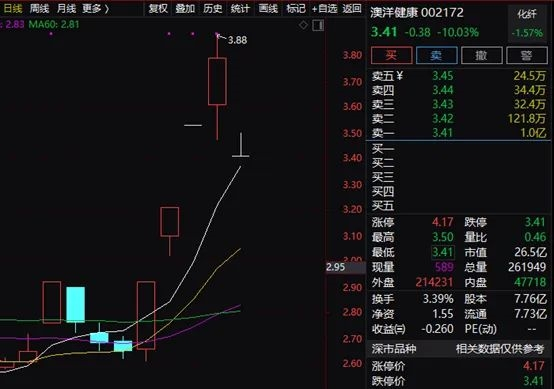 比如此前连续4个交易日大涨的澳洋健康,今天开盘突然跌停,盘中短暂打开后,全天多数时间封死跌停至收盘。