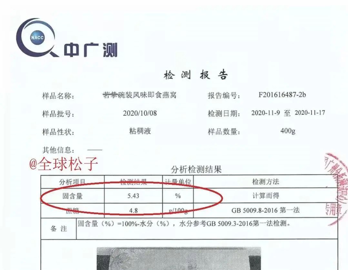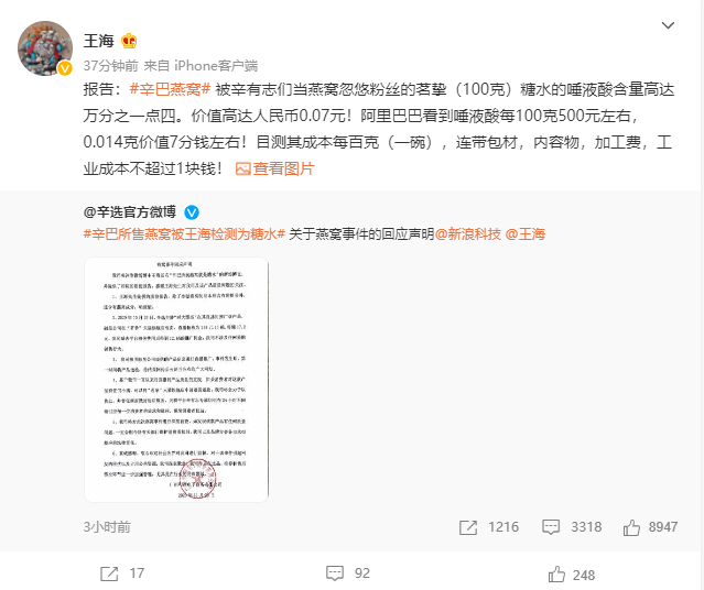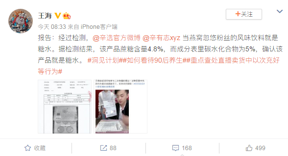 11月19日早间,职业打假人、微博认证为“知名法律博主、头条文章作者”的王海发布一份检测报告,并配文称:经过检测,@辛选官方微博 @辛有志xyz 当燕窝忽悠粉丝的风味饮料就是糖水。据检测结果,该产品蔗糖含量4.8%,而成分表里碳水化合物为5%,确认该产品就是糖水。