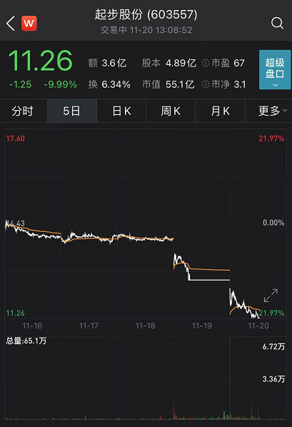值得注意的是,此前获辛巴入股,股价一度走出连续5个涨停的起步股份,今日上午开盘重挫;下午则开盘跌停,报11.26元,总市值55.1亿元。算上前一天的跌停,两个交易日市值蒸发约12.9亿元(以18日收盘价13.9元计算)。