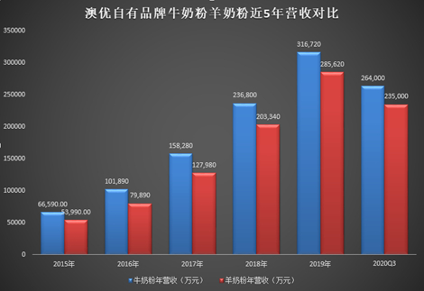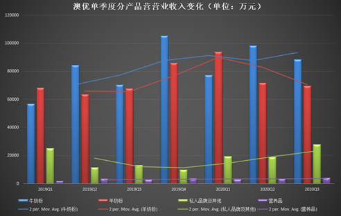 从近期季度数据来看,2019年、2020年第一季度澳优的羊奶粉营收甚至高于牛奶粉,2020年第一季度羊奶粉同比增长高达37.25%,第二季度增速降至12.88%,第三季度增速更是降至个位数增速仅2.68%。虽然澳优的整体营业收入在2020第三季度依然保持了23.14%的增长率,但羊奶粉业务单季度的突然失速或许不仅仅是因为疫情的影响。