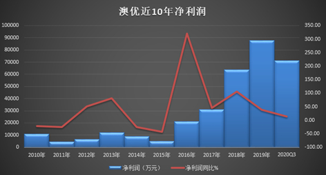 从净利润的增长情况来看,澳优的业绩一直不算平稳。澳优在2010年至2016年这6个年度中,有四个年度净利润同比下降,2015年的净利润在连续大降两年之后,甚至不及2013年的一半。2016年开始,澳优对外宣布“黄金10年”战略计划,澳优的开始进入新一轮的增长,但增长率依然呈现忽高忽低的状态。2020年在疫情的影响下,前三季度净利润增长率收窄至13.97%。