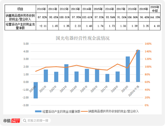 国光电器的“收现比”整体还不错:2011年以来基本围绕100%上下浮动,没有出现大幅偏低的情况,说明基本能实现钱货两清;此外,从经营活动产生的现金流净额也能看出其经营性现金流比较稳定,2011年至2020年上半年均保持正值,累计超20亿元,是同期净利润的2倍多。