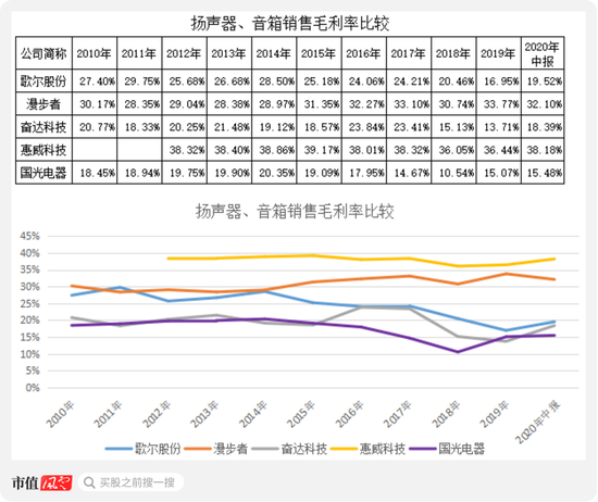 国光电器的扬声器、音箱销售毛利率基本都低于20%最低的,2018年一度下降到10%,是5家公司中最低的;漫步者的毛利率较高,这正是其营业收入低于国光电器,但利润却高于后者的原因。