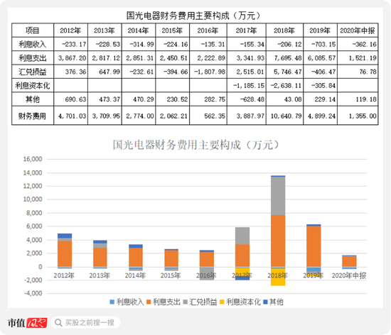 通过对2012年到2019年的分析发现,如果没有其他业务扩张或生产线扩张,国光电器的利息支出应该是每年两三千万,而人民币对美元的汇率变动就成影响其财务费用非常重要的因素。